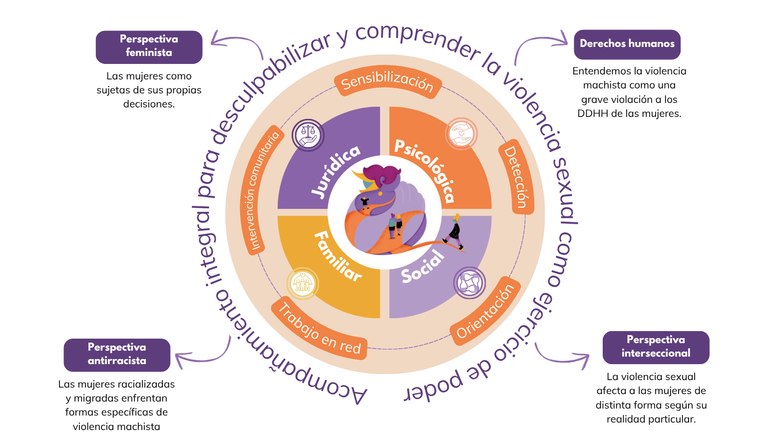 Acompañamos y apoyamos el camino de la recuperación que emprenden las supervivientes de violencias sexuales, desde la empatía, el respeto a los procesos individuales de cada mujer, el abordaje integral de las violencias que atraviesan cada vida, el trabajo en red y la coordinación entre instituciones.